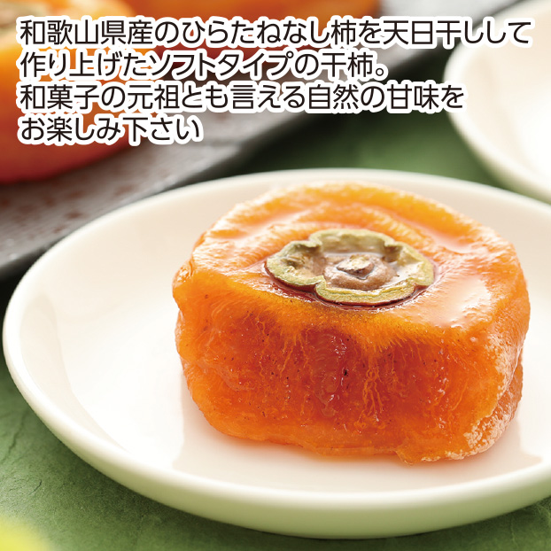 和歌山県産のひらたねなし柿を天日干しして作り上げたソフトタイプの干柿。和菓子の元祖とも言える自然の甘味をお楽しみ下さい