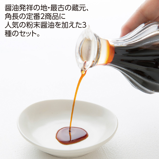 醤油発祥の地・最古の蔵元、角長の定番2商品に人気の粉末醤油を加えた3種のセット。