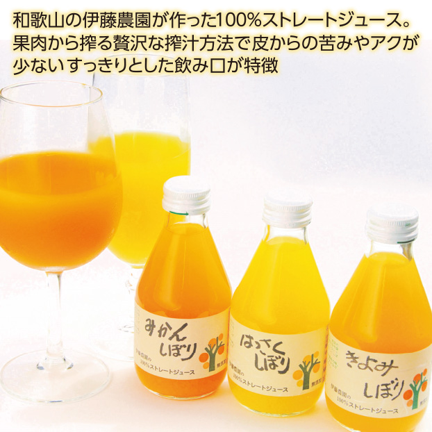 和歌山の伊藤農園が作った100%ストレートジュース。果肉から搾る贅沢な搾汁方法で皮からの苦みやアクが少ないすっきりとした飲み口が特徴