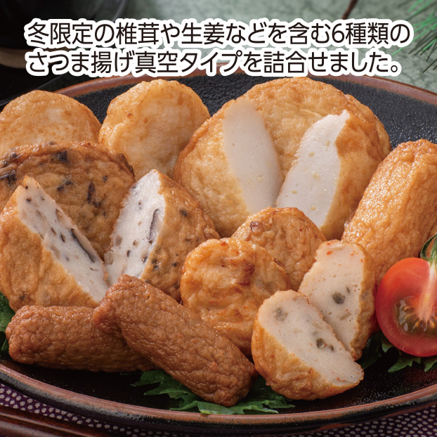 冬限定の椎茸や生姜などを含む6種類のさつま揚げ真空タイプを詰合せました。