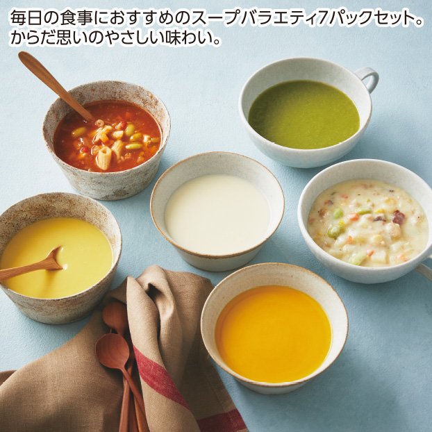毎日の食事におすすめのスープバラエティ7パックセット。 からだ思いのやさしい味わい。
