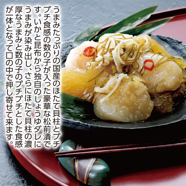 うまみたっぷりの国産のほたて貝柱とプチプチ食感の数の子が入った豪華な松前漬です。いかと昆布から独自のしょうゆダレにうまみが染み出し、さらにほたて貝柱の濃厚なうまみと数の子のプチプチとした食感が一体となって口の中で押し寄せて来ます。
