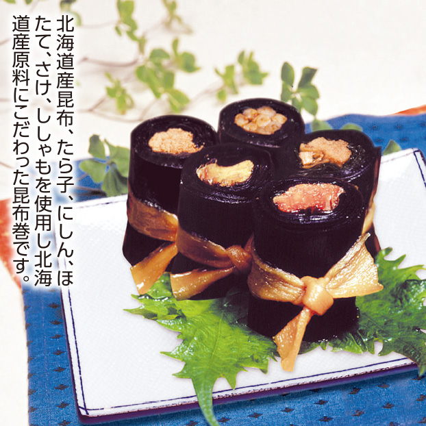 北海道産昆布、たら子、にしん、ほたて、さけ、ししゃもを使用し北海道産原料にこだわった昆布巻です。