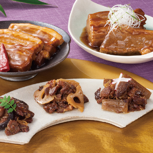 - ※牛肉椎茸しぐれ煮55g、牛肉蓮根しぐれ煮55g、牛肉牛蒡しぐれ煮55g、牛角煮100g、黒豚角煮100g