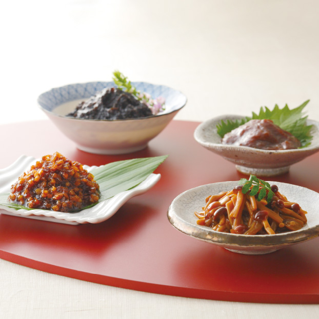 - ※京都九条ねぎ味噌90g、秋田鳥海山麓ふき45g、北海道帆立甘辛煮55g、静岡鰹でんぶ45g、徳島阿波尾鶏しぐれ煮55g、和歌山南高梅かつお90g、三重磯のり90g、茨城蓮根柚子風味55g、鹿児島青さのり90g、青森牛蒡やわらか煮55g、長野柿の木茸85g、瀬戸内ちりめん山椒40g