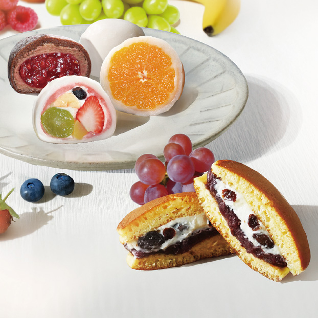 いちご、ぶどう、栗、バナナ、ブルーベリーと5種の果実を包んだ色とりどりで贅沢な大福の詰合せ。