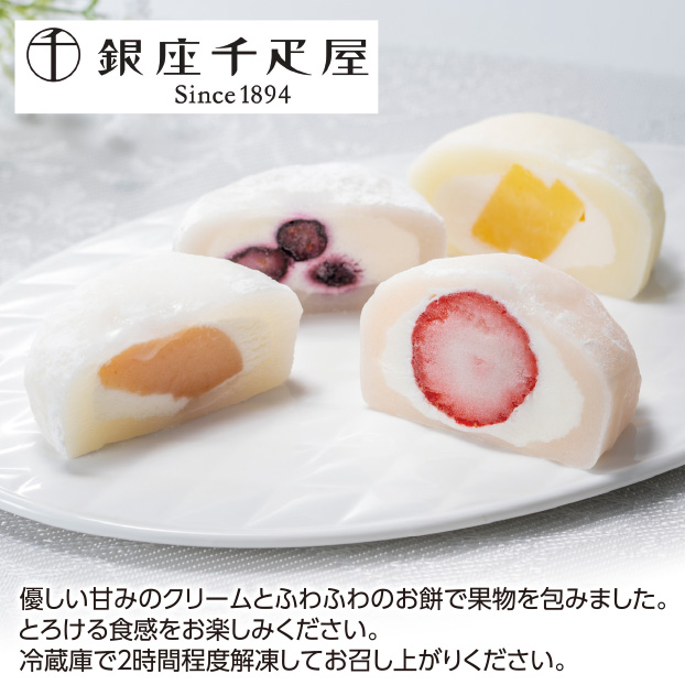 優しい甘みのクリームとふわふわのお餅で果物を包みました。とろける食感をお楽しみください。冷蔵庫で2時間程度解凍してお召し上がりください。
