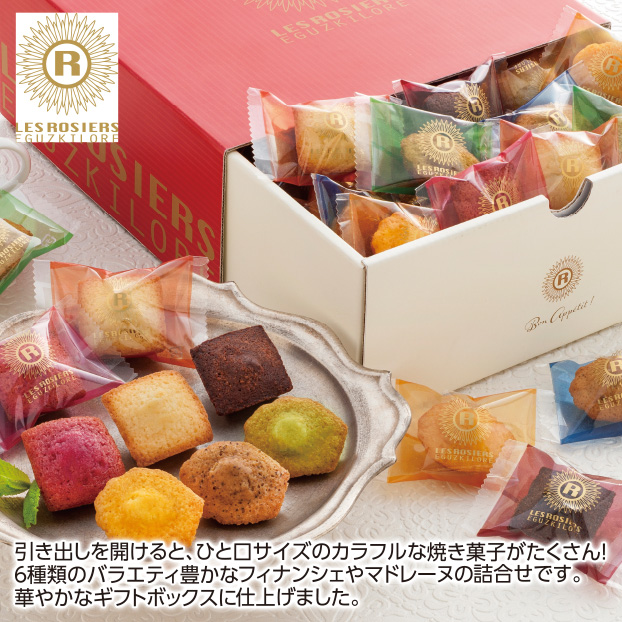 引き出しを開けると、ひと口サイズのカラフルな焼き菓子がたくさん!6種類のバラエティ豊かなフィナンシェやマドレーヌの詰合せです。華やかなギフトボックスに仕上げました。