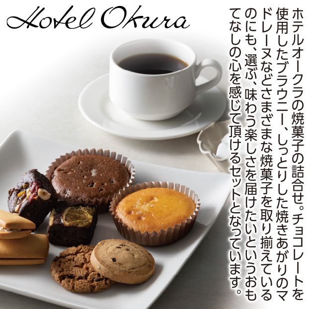 ホテルオークラの焼菓子の詰合せ。チョコレートを使用したブラウニー、しっとりした焼きあがりのマドレーヌなどさまざまな焼菓子を取り揃えているのにも、選ぶ、味わう楽しさを届けたいというおもてなしの心を感じて頂けるセットとなっています。