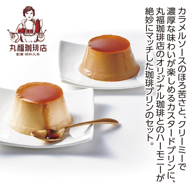 カラメルソースのほろ苦さと、クリーミーで濃厚な味わいが楽しめるカスタードプリンに、丸福珈琲店のオリジナル珈琲とのハーモニーが絶妙にマッチした珈琲プリンのセット。