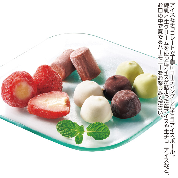 アイスをチョコレートで丁寧にコーティングしたチョコアイスボール。練乳と生クリームを使ったアイスが詰まった苺アイスや生チョコアイスなど、お口の中で奏でるハーモニーをお楽しみください。