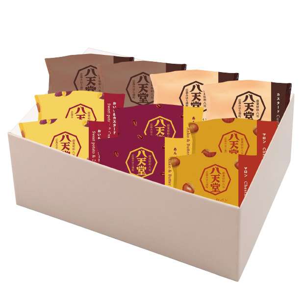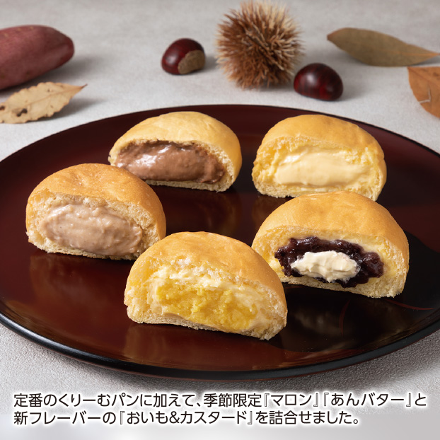 定番のくりーむパンに加えて、季節限定『マロン』『あんバター』と新フレーバーの『おいも&カスタード』を詰合せました。