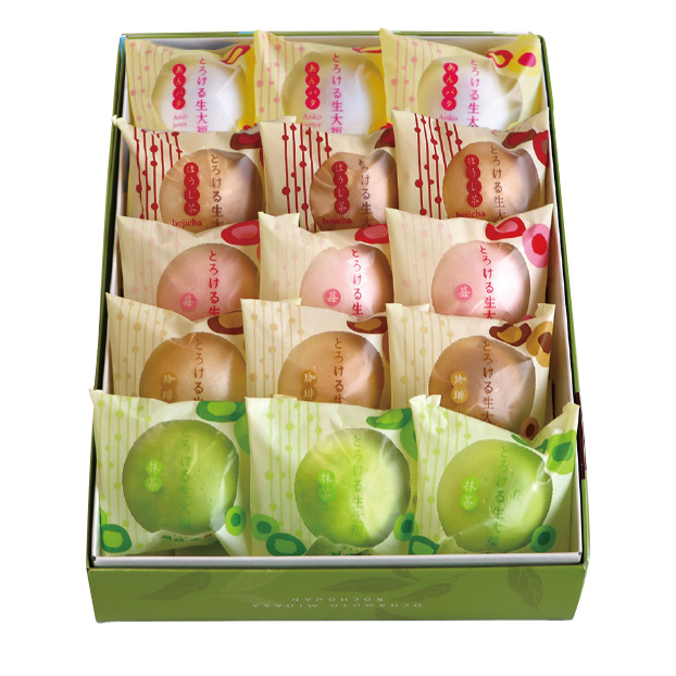 - ※とろける生大福(抹茶×3個、苺×3個、珈琲×3個、ほうじ茶×3個、あんバタ×3個)
