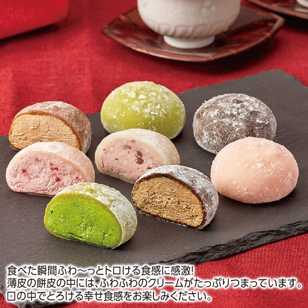 食べた瞬間ふわ~っとトロける食感に感激!薄皮の餅皮の中には、ふわふわのクリームがたっぷりつまっています。口の中でとろける幸せ食感をお楽しみください。