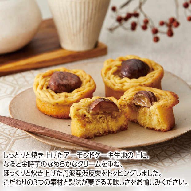 しっとりと焼き上げたアーモンドケーキ生地の上に、なると金時芋のなめらかなクリームを重ね、ほっくりと炊き上げた丹波産渋皮栗をトッピングしました。こだわりの3つの素材と製法が奏でる美味しさをお愉しみください。
