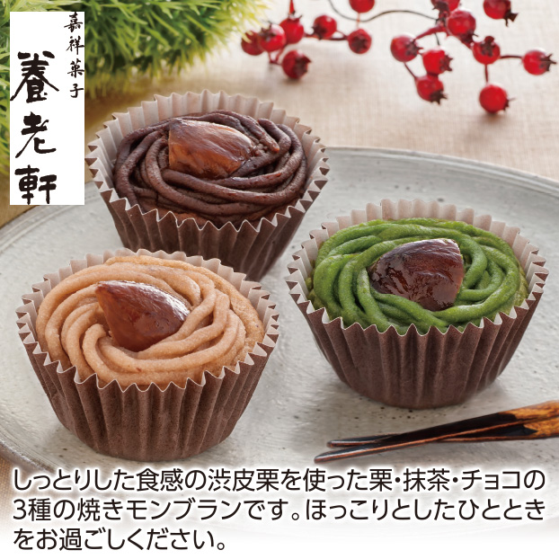 しっとりした食感の渋皮栗を使った栗・抹茶・チョコの3種の焼きモンブランです。ほっこりとしたひとときをお過ごしください。