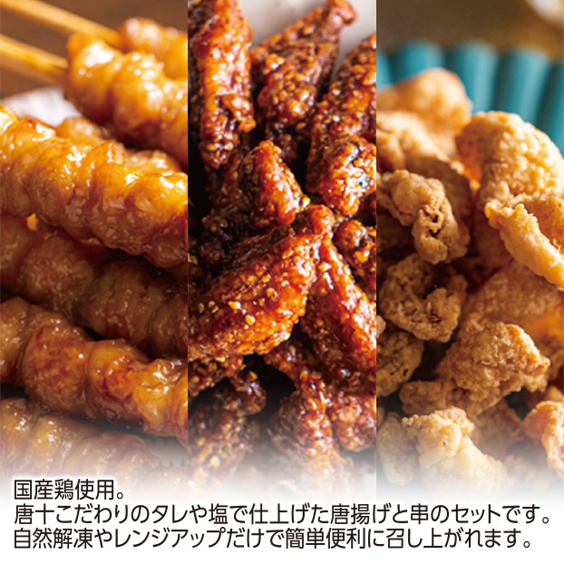 国産鶏使用。唐十こだわりのタレや塩で仕上げた唐揚げと串のセットです。自然解凍やレンジアップだけで簡単便利に召し上がれます。