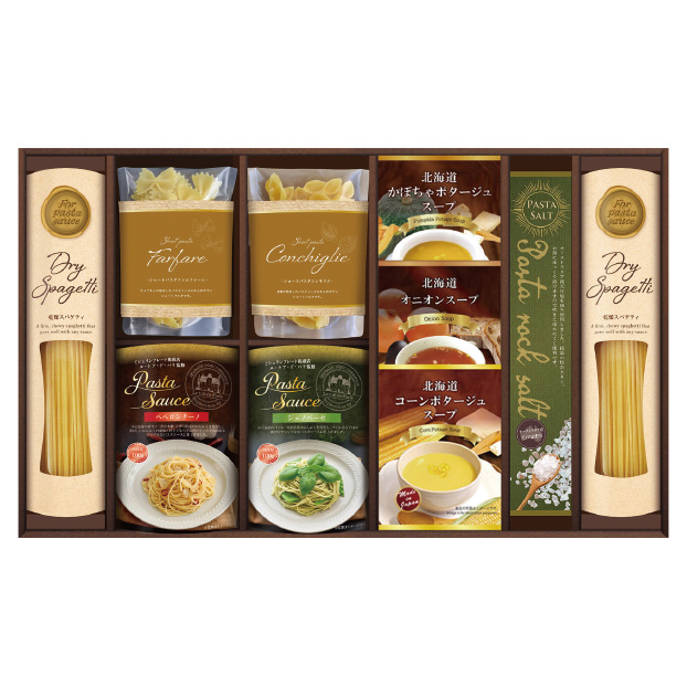 - ※スパゲティ130g×2、パスタソルト100g、マカロニコンキリエ70g、マカロニファルファーレ60g、ル・トア・ド・パリ監修あえるパスタソース(ジェノベーゼ)100g、ル・トア・ド・パリ監修あえるパスタソース(ペペロンチーノ)100g、北海道スープ(コーンポタージュ16.5gg、オニオンスープ7g、、かぼちゃポタージュ16.5g)