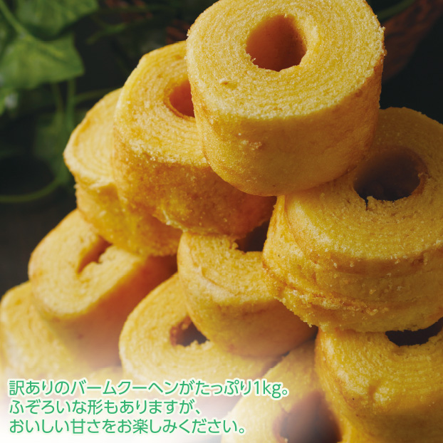 訳ありのバームクーヘンがたっぷり1kg。ふぞろいな形もありますが、おいしい甘さをお楽しみください。