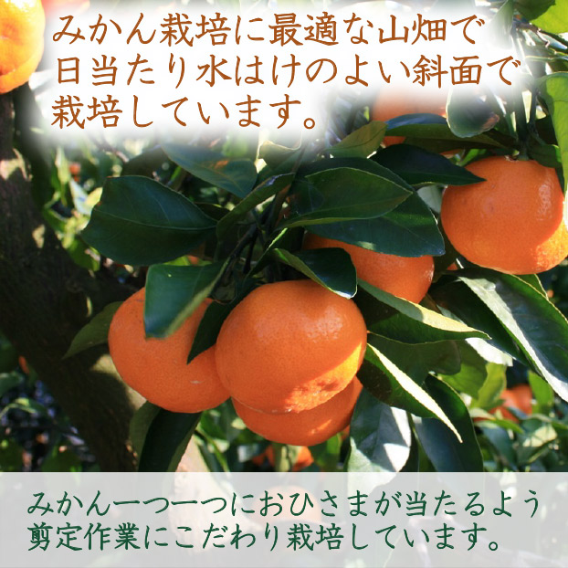 みかん栽培に最適な山畑で日当たり水はけのよい斜面で栽培しています。みかん一つ一つにおひさまが当たるよう剪定作業にこだわり栽培しています。