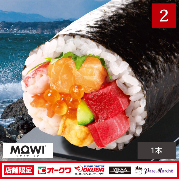 本まぐろの最高峰アイルランド北沖漁獲の天然本まぐろを贅沢に盛り込み、オークワプレミアムのMowiサーモン、北海道産味付けいくら、オークワプレミアムのかに棒肉など魚屋こだわりのネタを巻き込んだご馳走海鮮太巻きです。