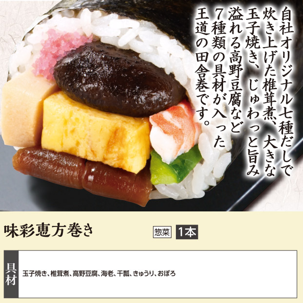 自社オリジナル七種だしで炊き上げた椎茸煮、大きな玉子焼き、じゅわっと旨み溢れる高野豆腐など7種類の具材が入った王道の田舎巻です。
