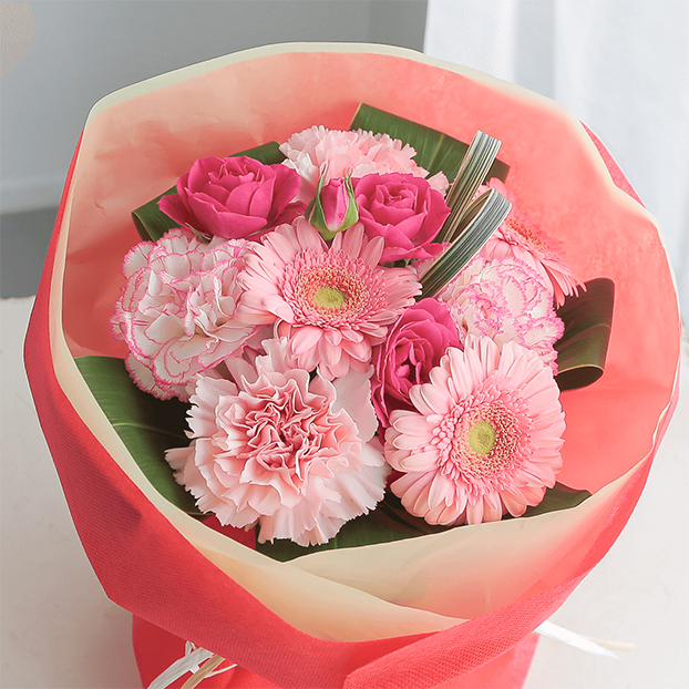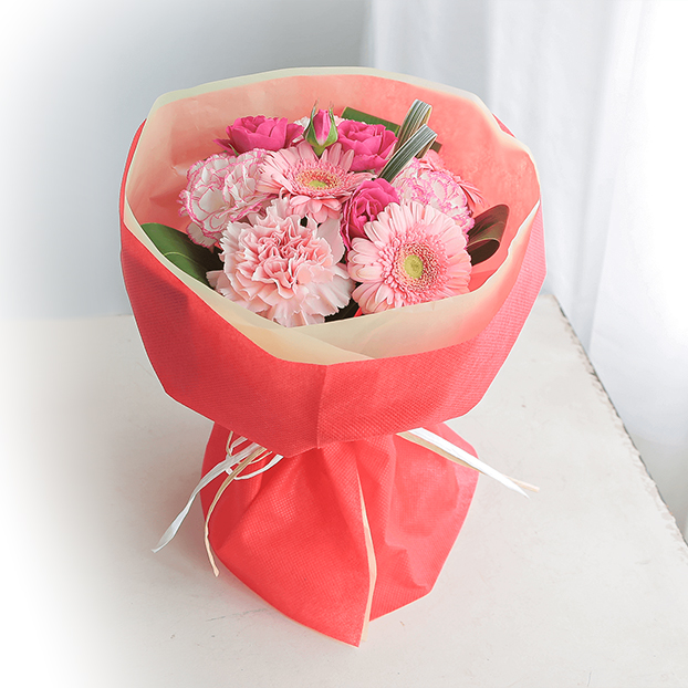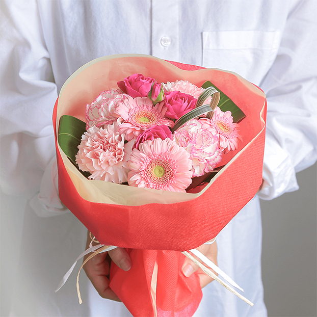 形が可愛らしく明るくキュートな雰囲気のピンク色のガーベラをメインに、ふんわり優しいピンク色のカーネーションや2種のグリーンを合わせました。