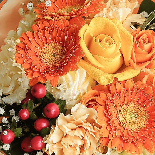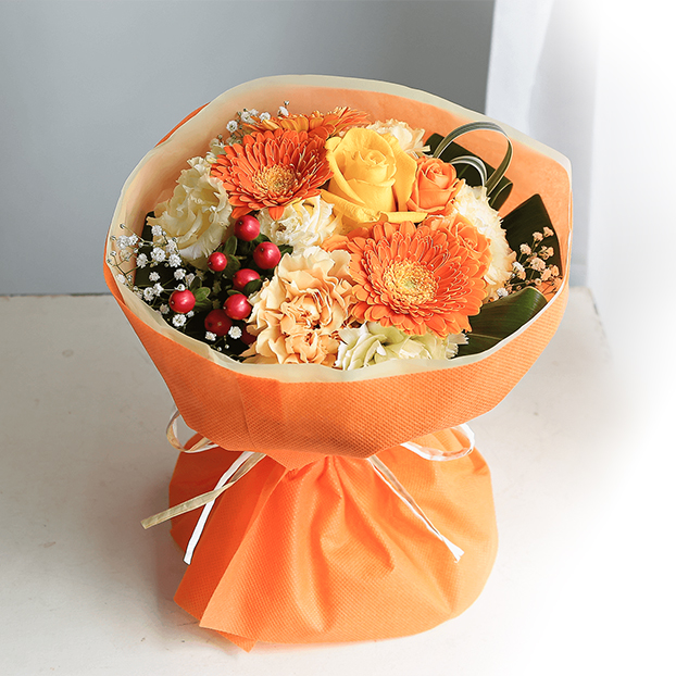 形が可愛らしく明るくポジティブな雰囲気のオレンジ色のガーベラをメインに、爽やかなグリーンのカーネーションやヒペリカム、カスミソウなどを合わせ、カラフルでボリュームたっぷりの花束です。