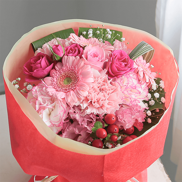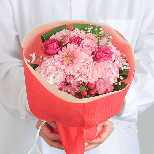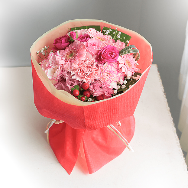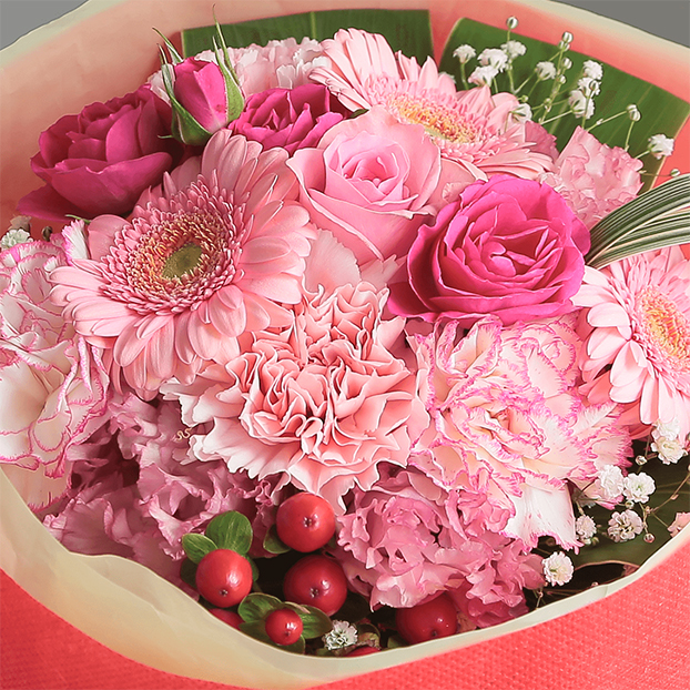 形が可愛らしく明るくキュートな雰囲気のピンク色のガーベラをメインに、ふんわり優しいピンク色のカーネーションやヒペリカム、カスミソウなどを合わせ、カラフルでボリュームたっぷりの花束です。