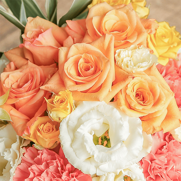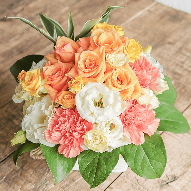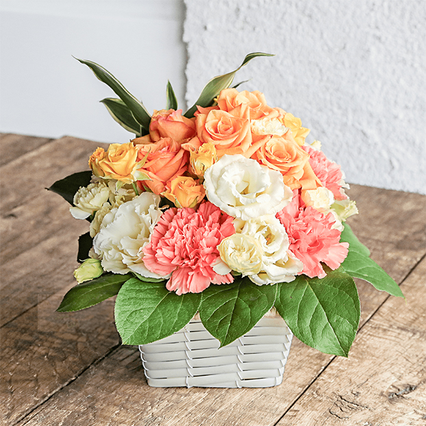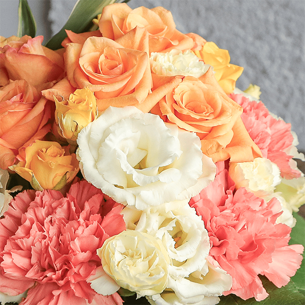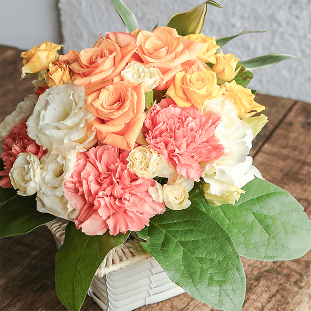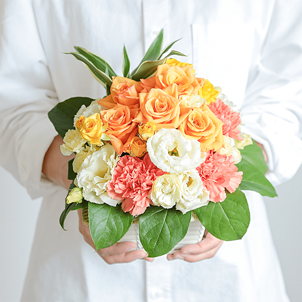 オレンジ色のバラをメインにポジティブな気分になれるビタミンカラーで、グラデーションが美しいアレンジメントです。