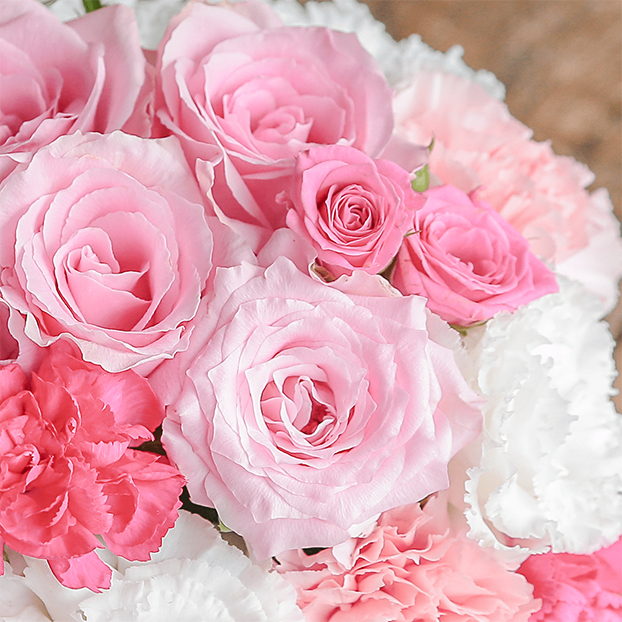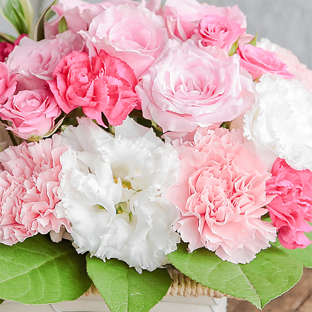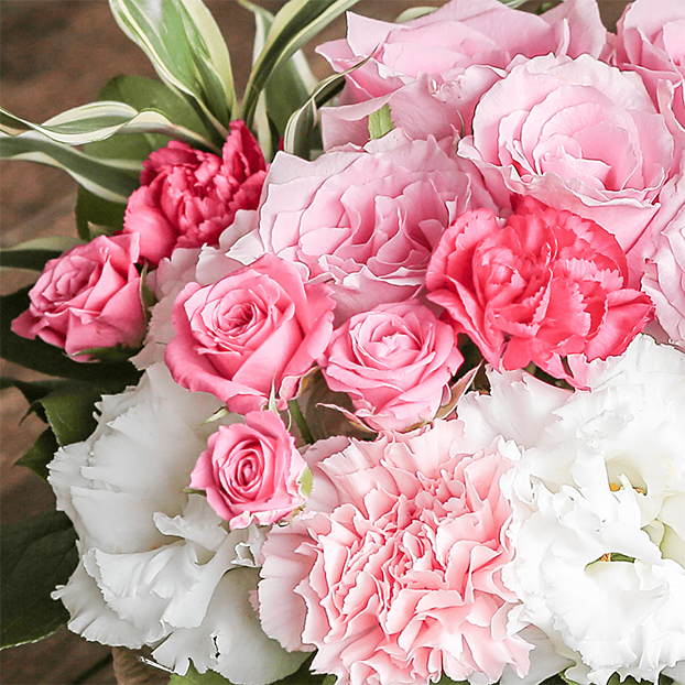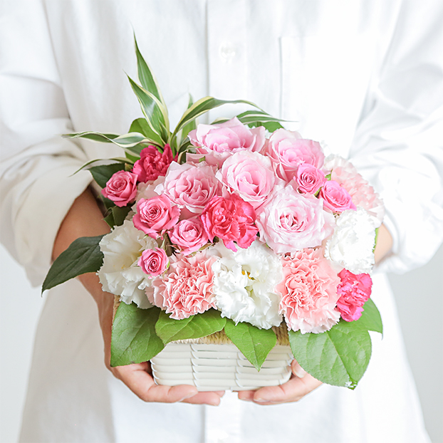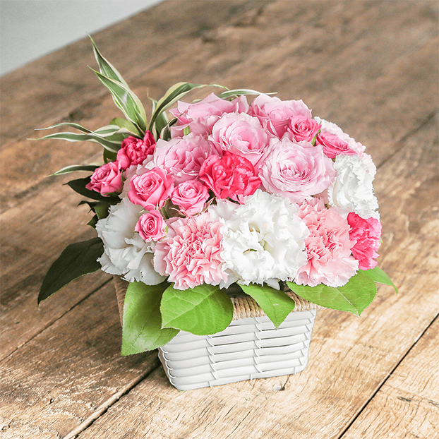 明るく元気なピンク色のバラをメインに濃いピンクのスプレーバラや白いトルコキキョウなどを組み合わせて、イチゴミルクのようなかわいいアレンジメントです。