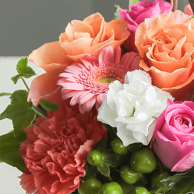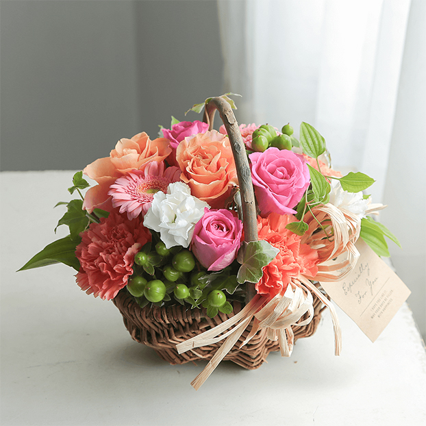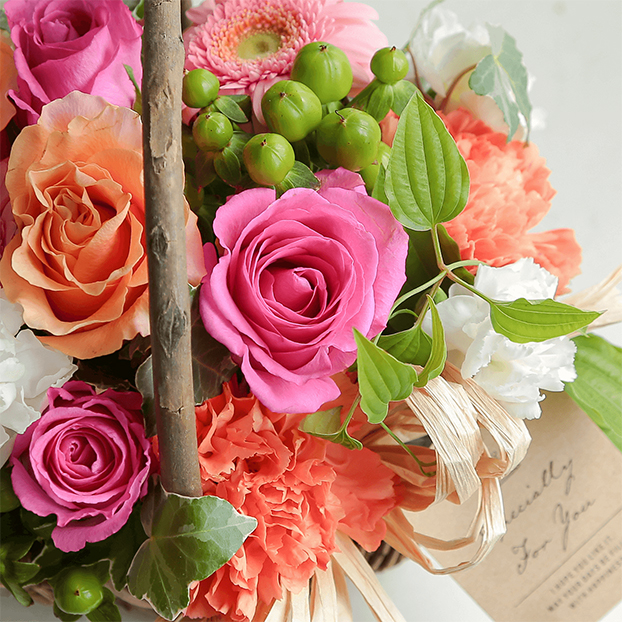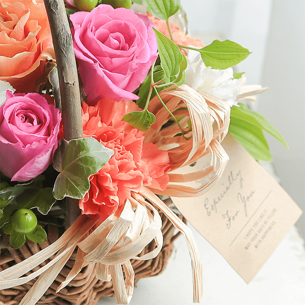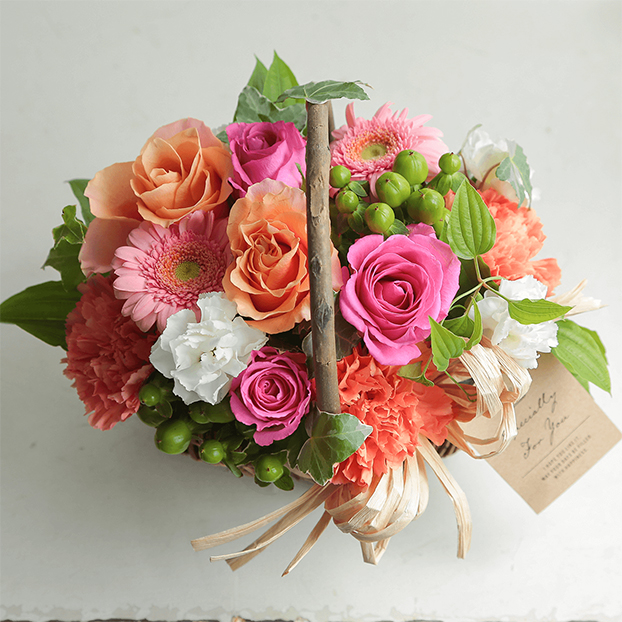 庭先から摘んできたようなカラフルな花々とバスケットの組み合わせにラフィアリボンとタグでナチュラルな雰囲気を演出。