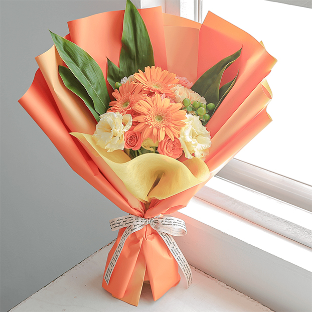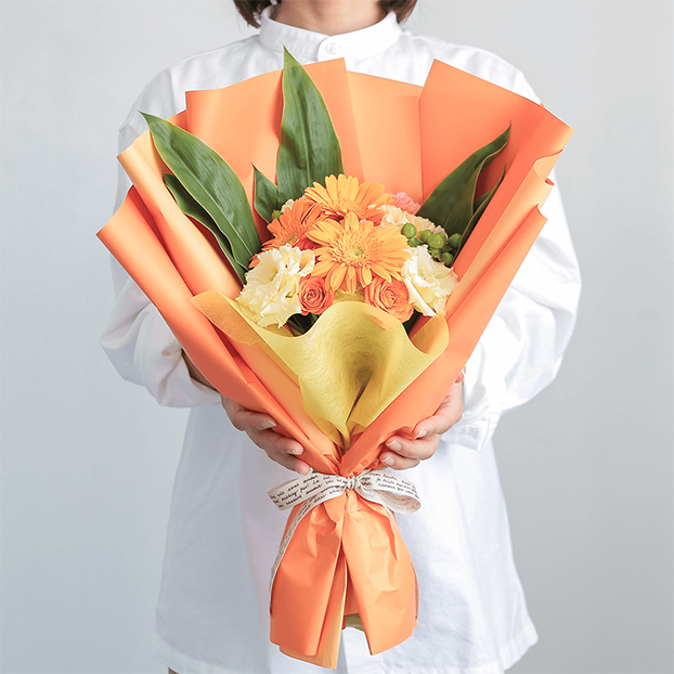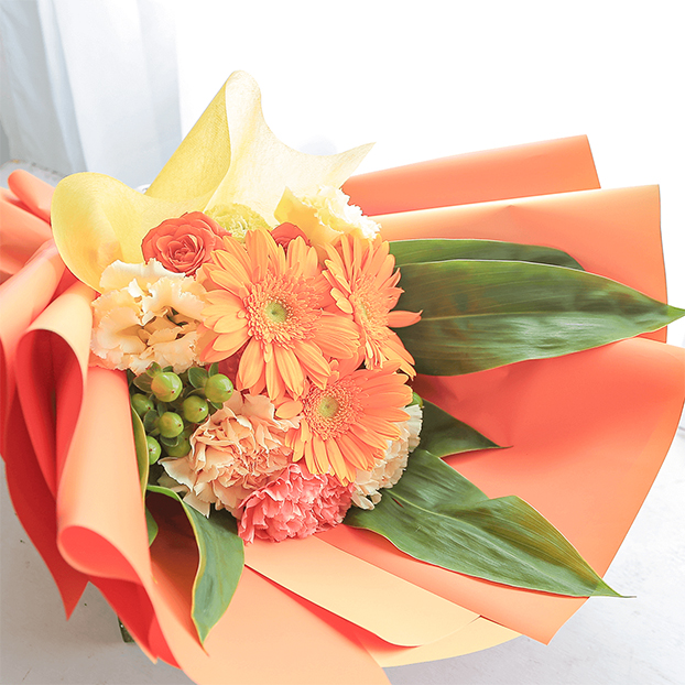 お日さまのように花開くオレンジ色のガーベラをメインにオレンジのミニバラやアプリコットのカーネーションを組み合わせて、眺めているだけで元気が出そうなビタミンカラーの花々を集めました。