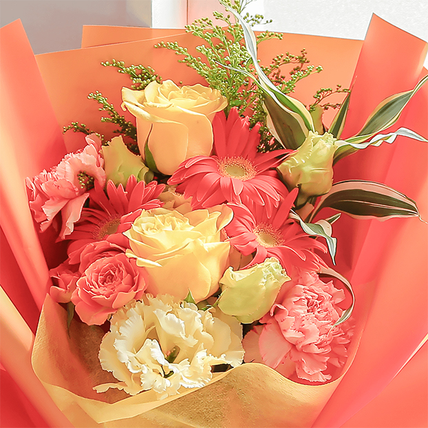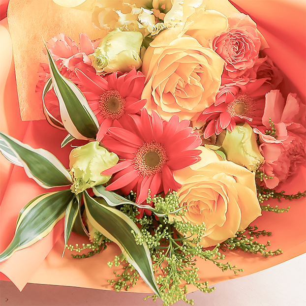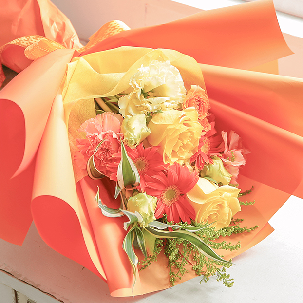 明るいオレンジ色のガーベラと黄色のバラをメインに、元気や笑顔を届けたい気持ちが伝わるビタミンカラーの鮮やかな花束。