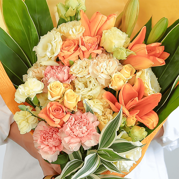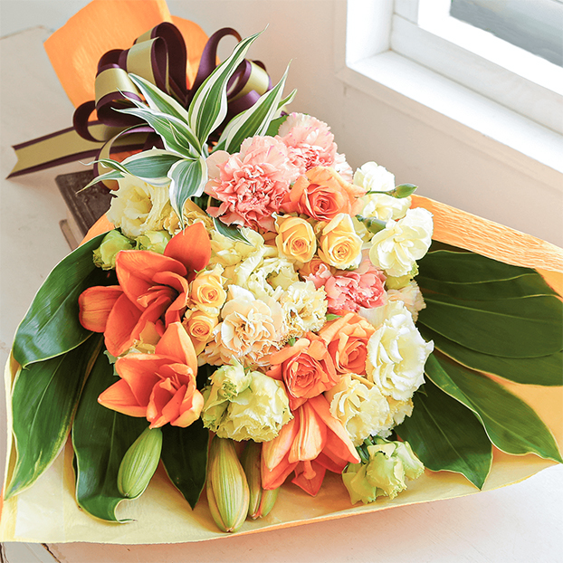 ユリをメインに、オレンジ色や黄色の花々を鮮やかに集めました。ビタミンカラーは元気や笑顔を届けたい気持ちが伝わります。