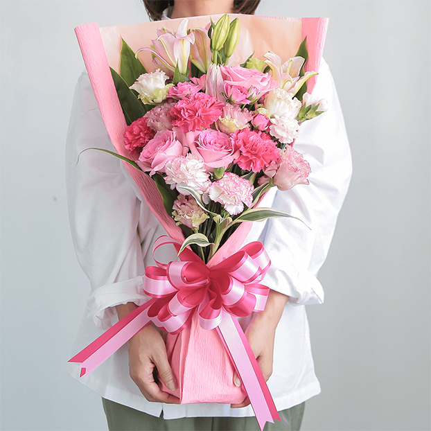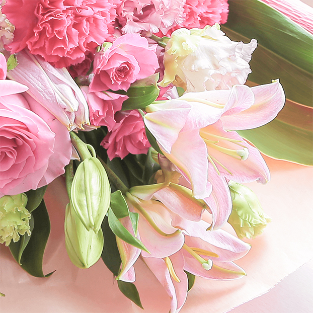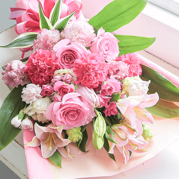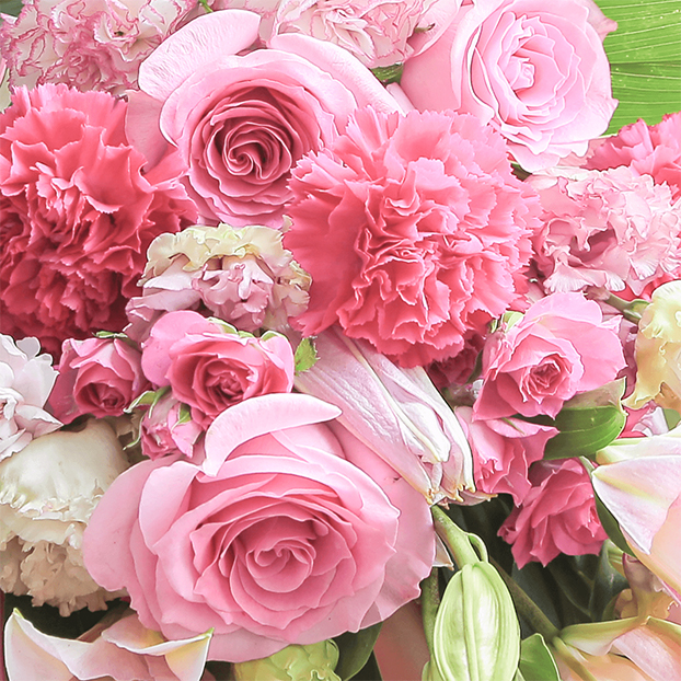 ピンク色のユリをメインに、薄いピンクから濃いピンクへのグラデーションが美しく、思わずため息が出てしまいそうな程、上品な花々を集めました。