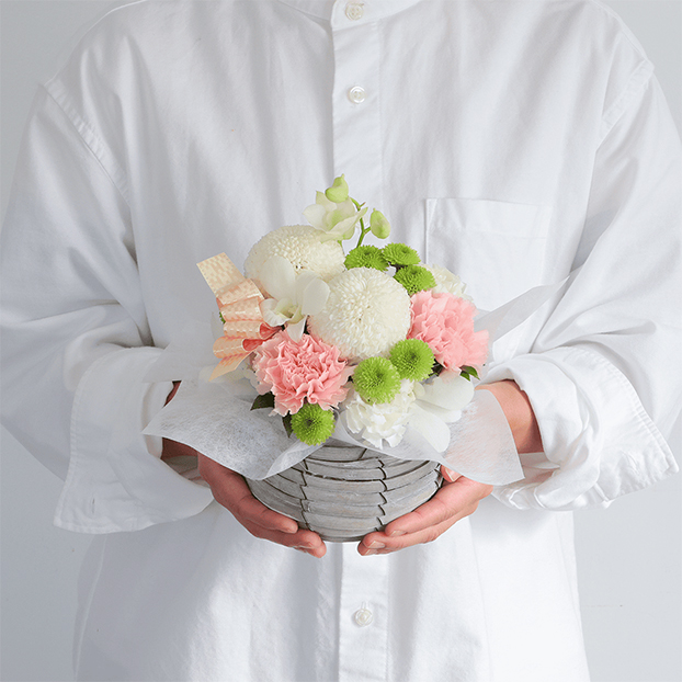 故人への想いをお花に込めて。白いピンポンマムと凛とした姿が美しい白色のデンファレを中心に、優しいピンクのカーネーション、グリーンのスプレーマムなどふんわり穏やかな雰囲気の花々をあわせ、丸いフォルムはお届け先に温かみを感じさせてくれます。
