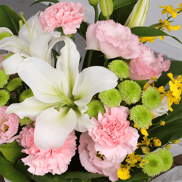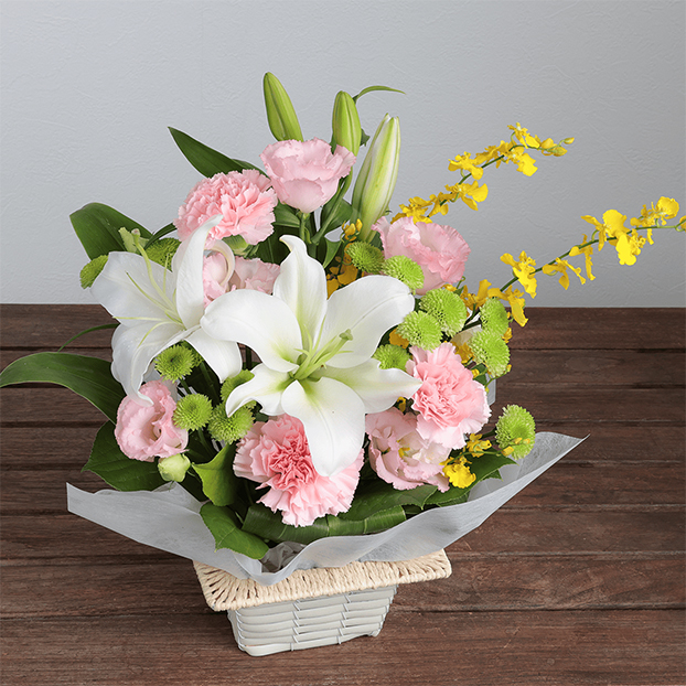 故人への想いをお花に込めて。高貴な白いユリと華やかな黄色のオンシジウムを取り合わせた高級感のあるお供え用アレンジメントです。優しいピンクのトルコキキョウとカーネーションなどを添えて、安らぎの空間を演出します。