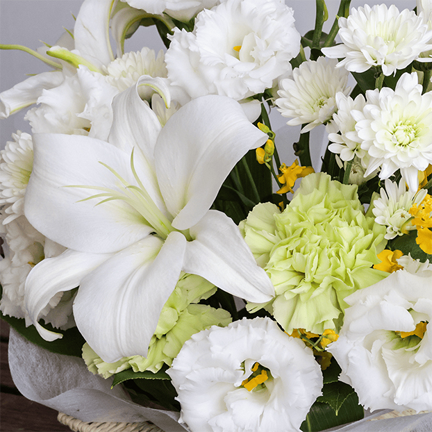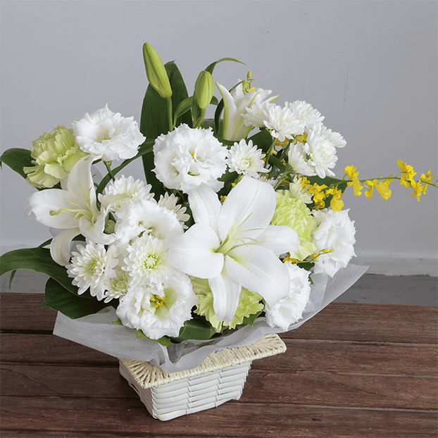 故人への想いをお花に込めて。高貴な白いユリと凛とした姿が美しい白色のデンファレなど高級感のある花々をたっぷりお届けできるアレンジメントスタイルですので、ご家族の手を煩わせることなく、仏前にお供えいただけます。