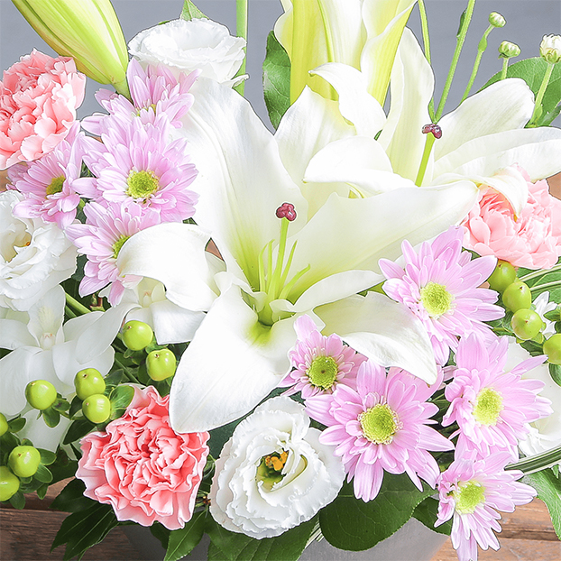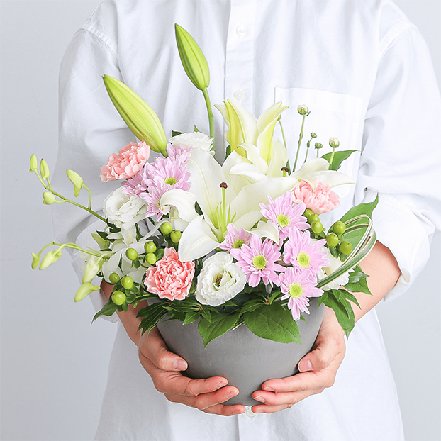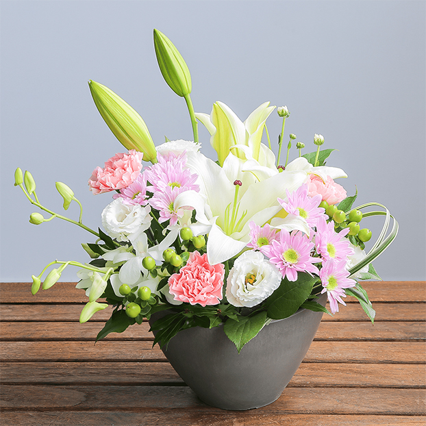 ユリ、デンファレを使用し、上品に仕上げました。グレーの器にミスカンサスをアクセントにしたスタイリッシュなアレンジメント。ピンクの花たちが悲しみの気持ちを優しく癒してくれそうです。