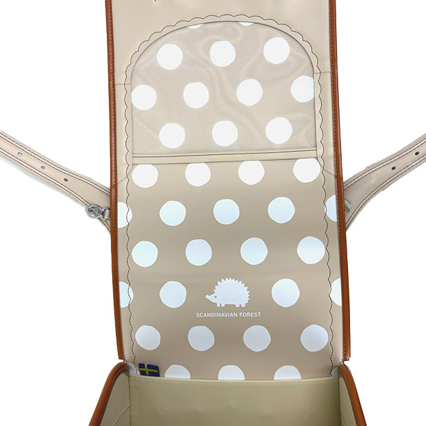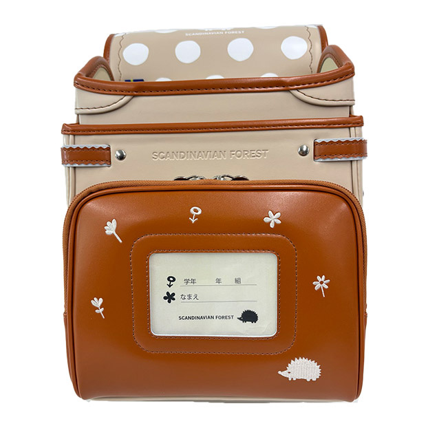 | ①本体と前段ポケットとのコンビカラー ②前段ポケットのハリネズミの刺繍デザイン ③ハリネズミデザインのオリジナルかぶせ鋲 |