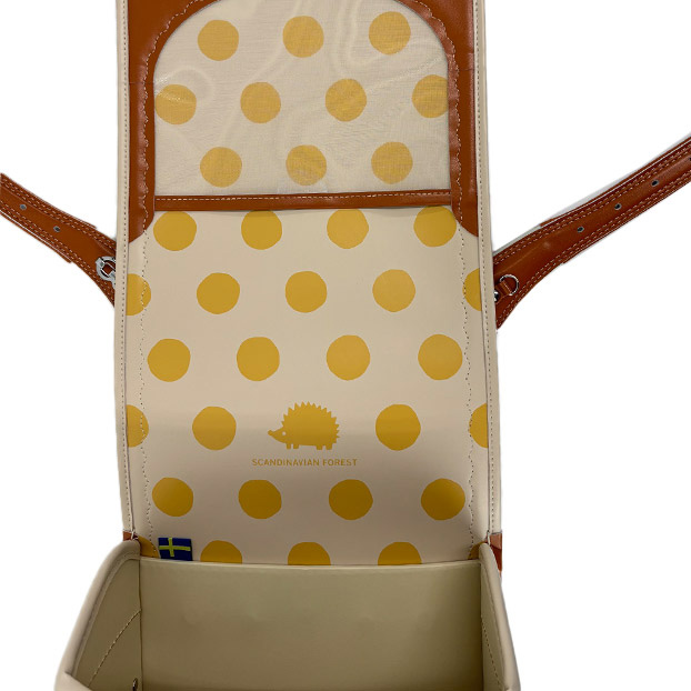 | ①本体と前段ポケットとのコンビカラー ②前段ポケットのハリネズミの刺繍デザイン ③ハリネズミデザインのオリジナルかぶせ鋲 |