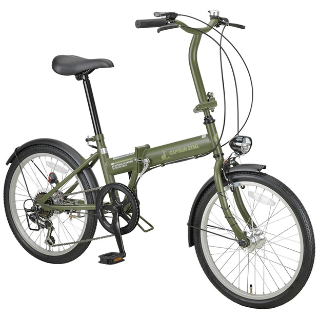 落ち着いたカラーの砲弾型LEDオートライト付き折りたたみ自転車。