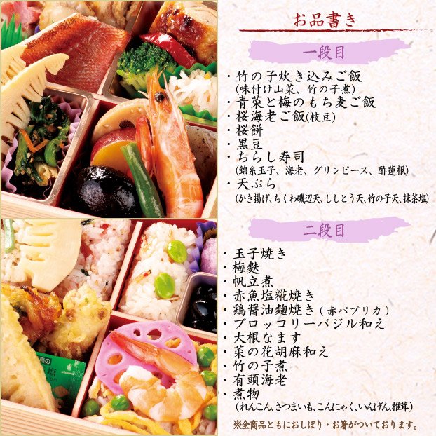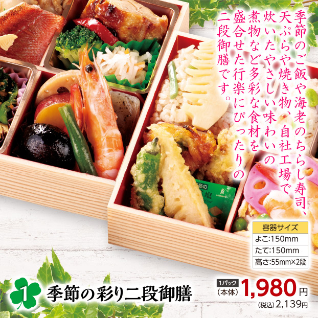 季節のご飯や海老のちらし寿司、天ぷらや焼き物、自社工場で炊いたやさしい味わいの煮物など多彩な食材を盛合せた行楽にぴったりの二段御膳です。