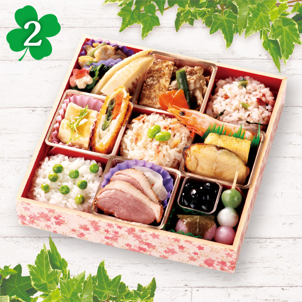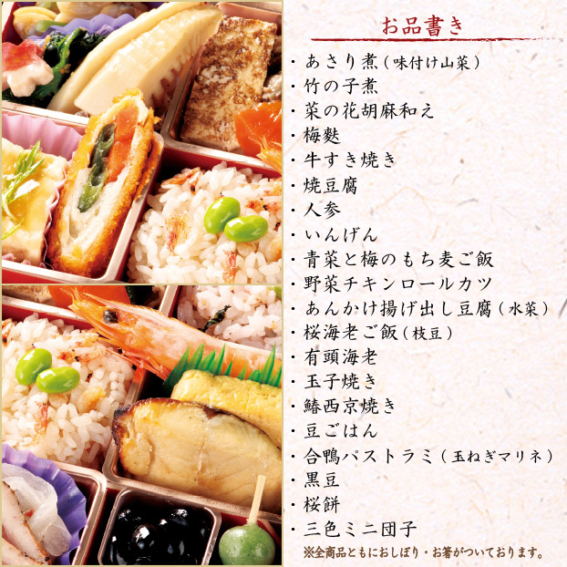 - ※あさり煮(味付け山菜)、竹の子煮、菜の花胡麻和え、梅麩、牛すき焼き、焼豆腐、人参、いんげん、青菜と梅のもち麦ご飯、野菜チキンロールカツ、あんかけ揚げ出し豆腐(水菜)、桜海老ご飯(枝豆)、有頭海老、玉子焼き、鰆西京焼き、豆ごはん、合鴨パストラミ(玉ねぎマリネ)、黒豆、桜餅、三色ミニ団子