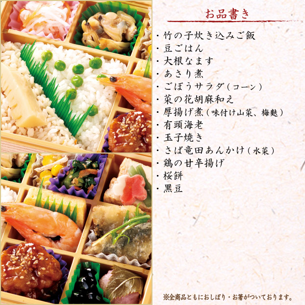 - ※竹の子炊き込みご飯、豆ごはん、大根なます、あさり煮、ごぼうサラダ(コーン)、菜の花胡麻和え、厚揚げ煮(味付け山菜、梅麩)、有頭海老、玉子焼き、さば竜田あんかけ(水菜)、鶏の甘辛揚げ、桜餅、黒豆