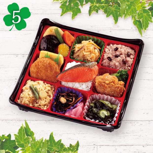 - ※鶏飯(山菜)、赤飯、白飯、紅鮭、コロッケ、玉子焼き、煮物(がんも、さつまいも、椎茸、人参、いんげん)、鶏の唐揚げ、ブロッコリー、きゅうりとわかめの酢の物、千切り大根煮、ひじき煮、さくら漬け