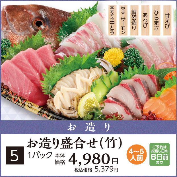 - ※本まぐろ中とろ、Mowiサーモン、鯛姿造り、あわび、ひらまさ、甘えび