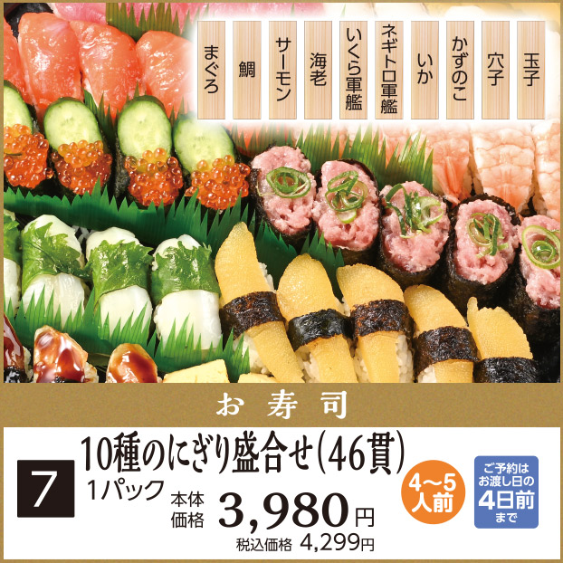 - ※まぐろ、鯛、サーモン、海老、いくら軍艦、ネギトロ軍艦、いか、かずのこ、穴子、玉子
