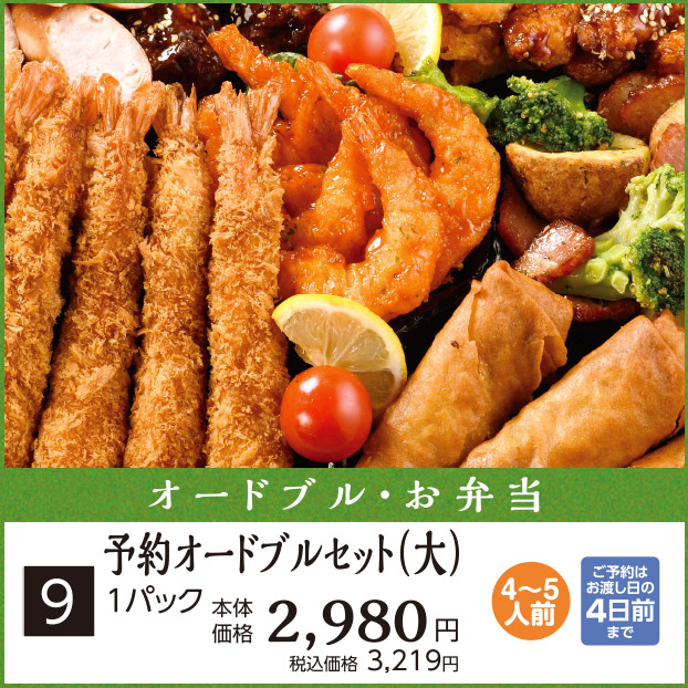 - ※エビフライ、チキン、春巻きなどを詰め合わせた4~5人前のオードブルです。